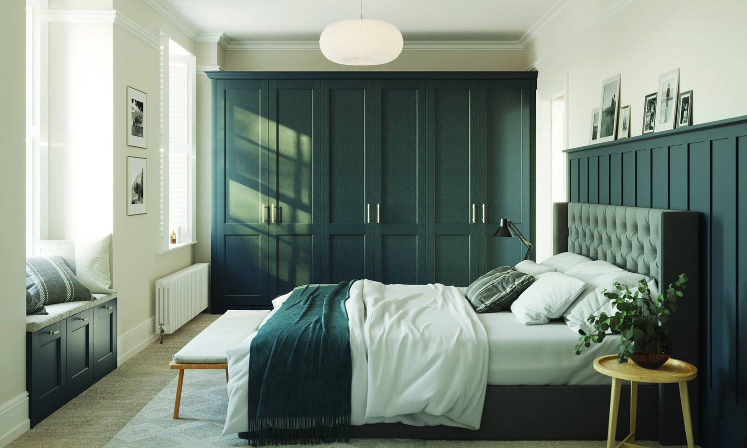 A decadent twist on a classic Shaker, the simple profile, textured woodgrain effect, ornate beading and neutral colour palette all help to create an elegant bedroom interior.