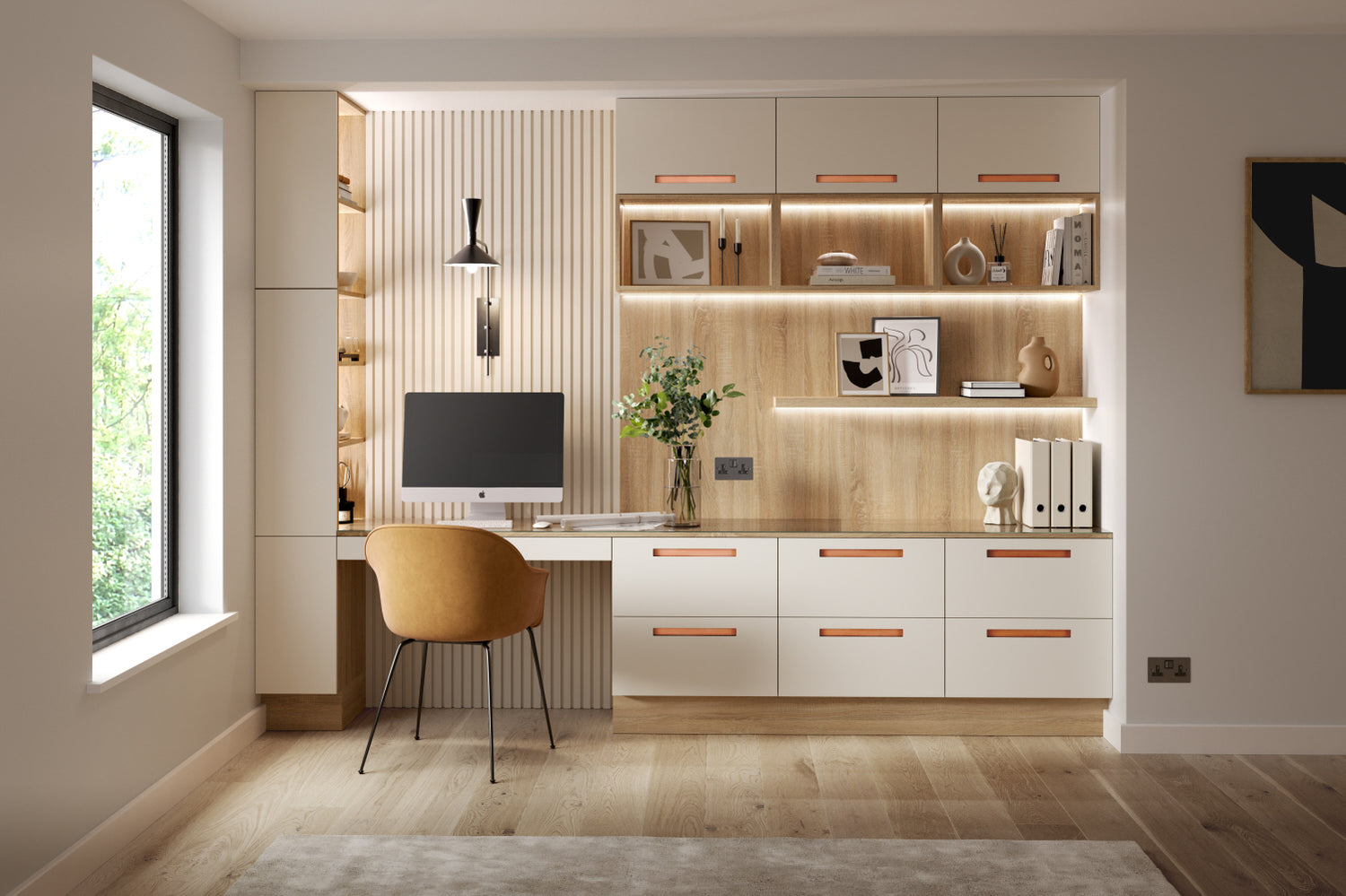 Offering an effortless, linear appearance, Porter is a slab door with a matt painted finish, perfect for creating a sleek, contemporary workstation. With its simplistic aesthetic, this range offers an ideal canvas for bringing personality through colour, accessories, and textures.